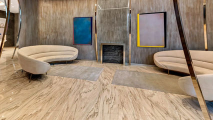 El aclamado arquitecto de interiores Massimo Iosa Ghini combina elegantes paredes de vidrio y líneas curvas para crear una sensación de movimiento: dar la bienvenida a las residencias a su llegada con calidez, luz y piedras preciosas.
